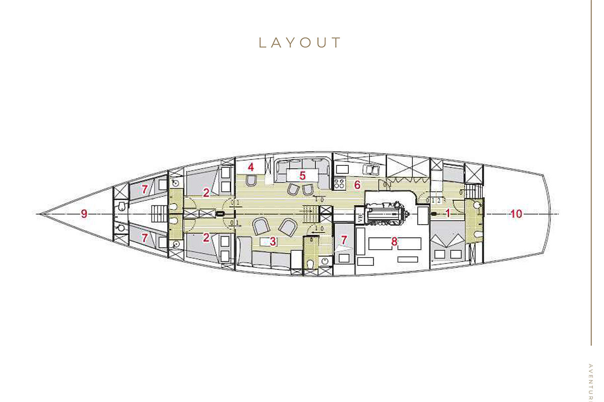 Aventure accommodates up to seven guests in three well-appointed double cabins and one single cabin. Each cabin offers a calm and comfortable space to relax after a full day on the water. Meanwhile, the wide decks allow guests to sunbathe, enjoy open-air dining, or take in sweeping sea views. In addition, the well-equipped galley supports fresh meals prepared daily by the crew.