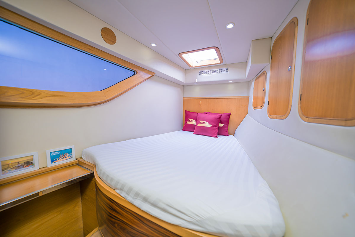 The Gedo Luxury Catamaran features four cabins and four bathrooms, each equipped with showers for privacy and convenience. In addition, the salon and dining areas offer space for socializing or casual gatherings. Not only is the yacht ideal for day trips, but it is also perfect for overnight charters, accommodating up to eight guests comfortably. On top of that, the flybridge and sunbathing zones provide ample room to soak up the sun or relax with a drink while cruising the Gulf of Thailand.
