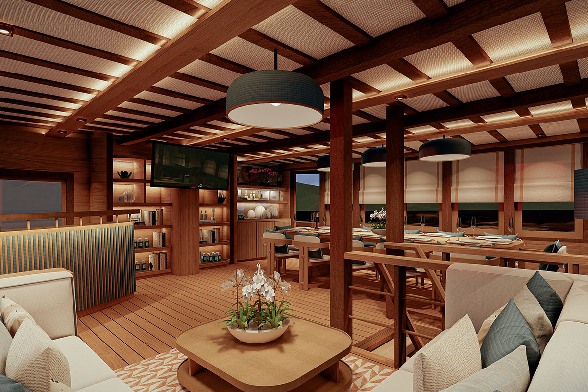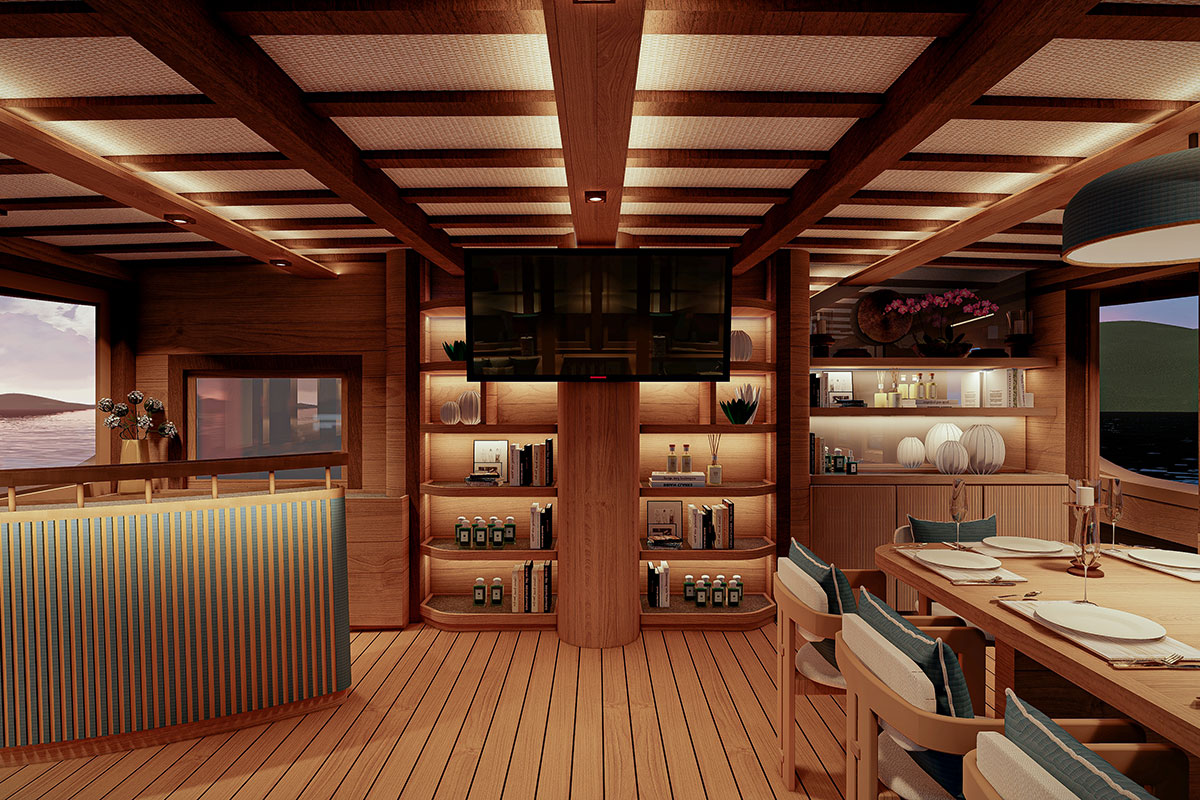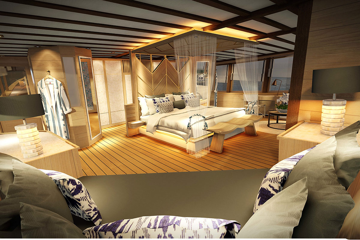 Each of her six suites is a private sanctuary of light, texture, and space — from the expansive Master Suite with a private balcony to the Queen Suite and four Deluxe Staterooms, all designed by Fresa Amalia in collaboration with Walter Wagner (architect of award-winning Nihi Sumba). Natural wood, soft tones, and refined finishes create an ambiance of understated luxury and homelike warmth.