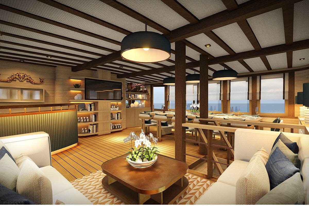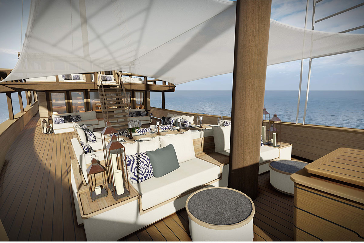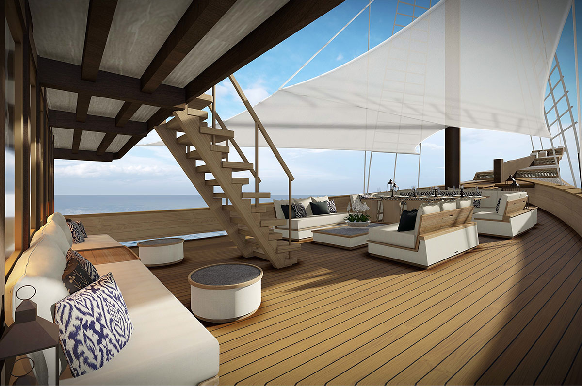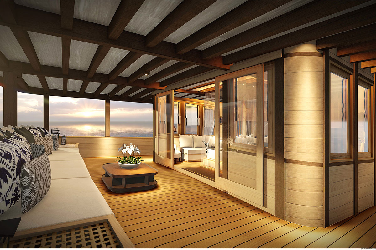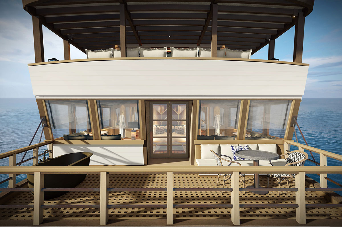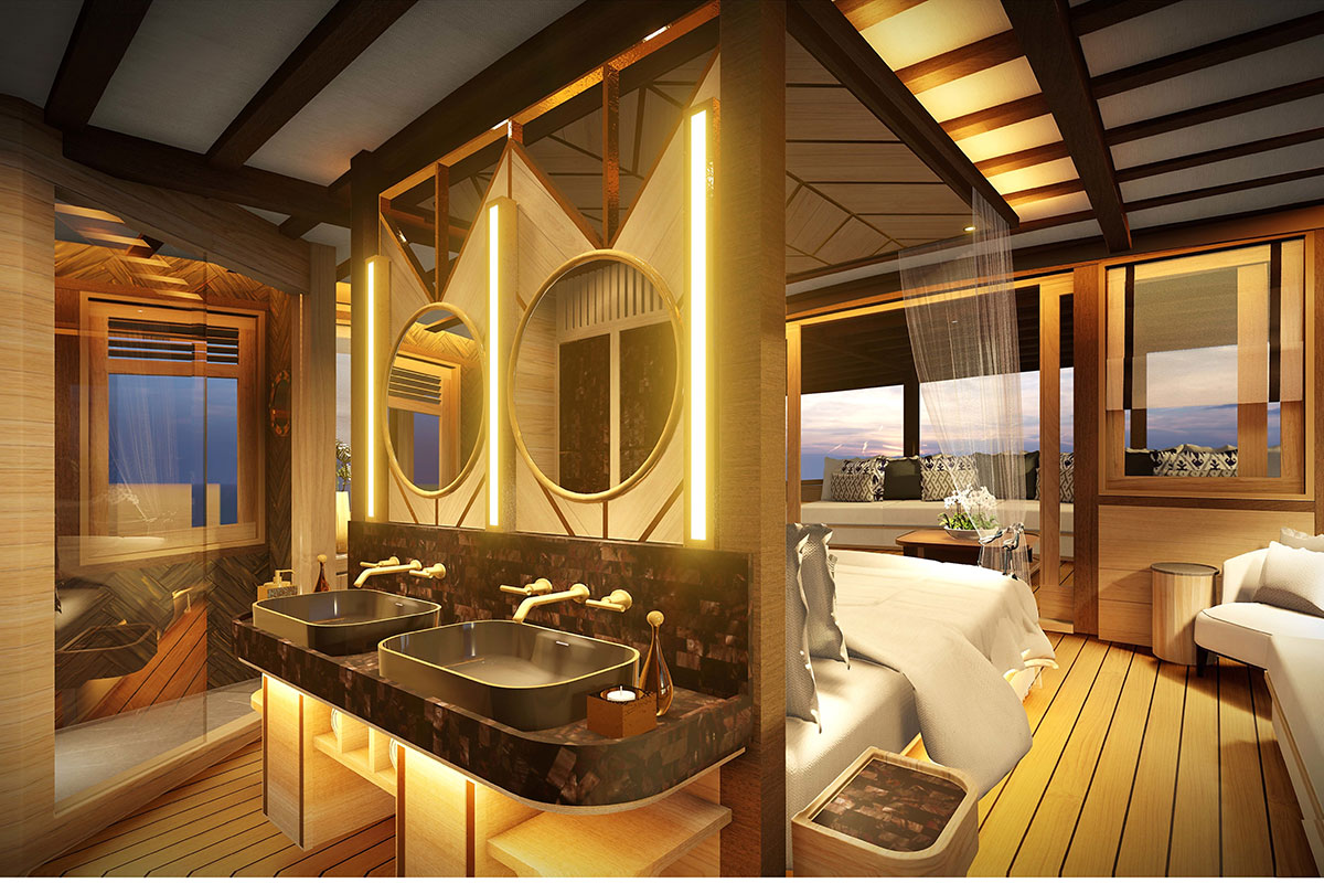 - The Day Club (45 m² Sundeck): Outdoor loungers, bow dining for 12, shaded retreats for relaxation or starlit dinners.